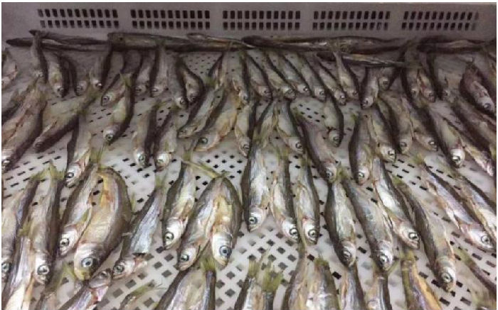 將蒸熟完畢的小魚放入托盤中擺到推車上,將推(tuī)車放入烘幹房中